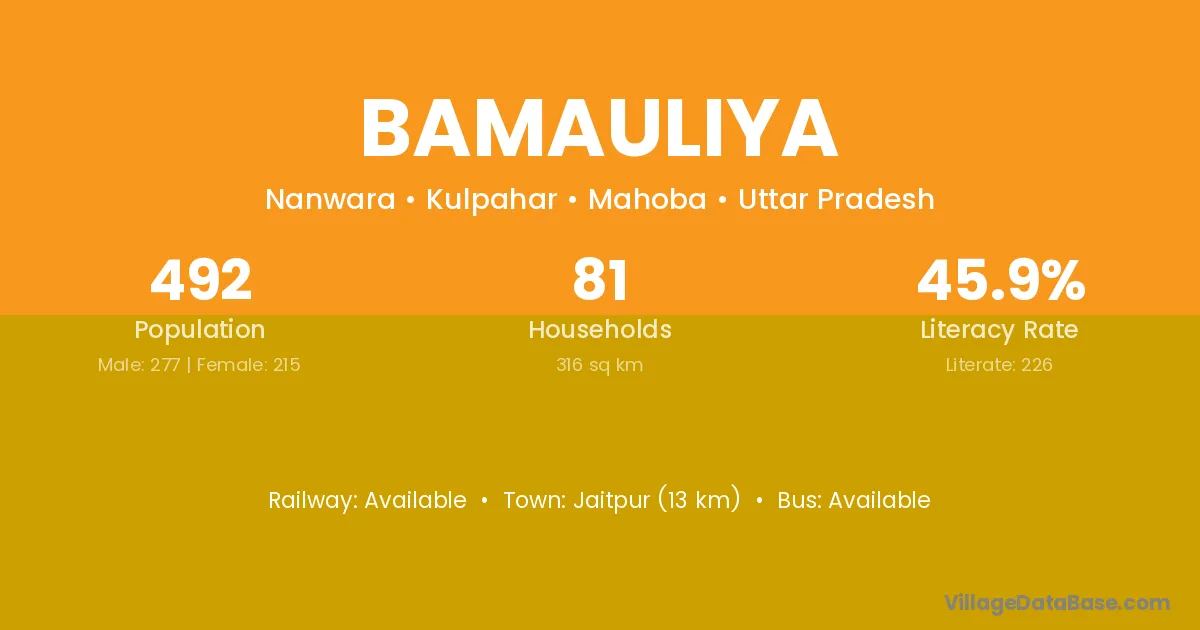 Bamauliya village has a total population of 492 people, of which 277 are males and 215 are females.