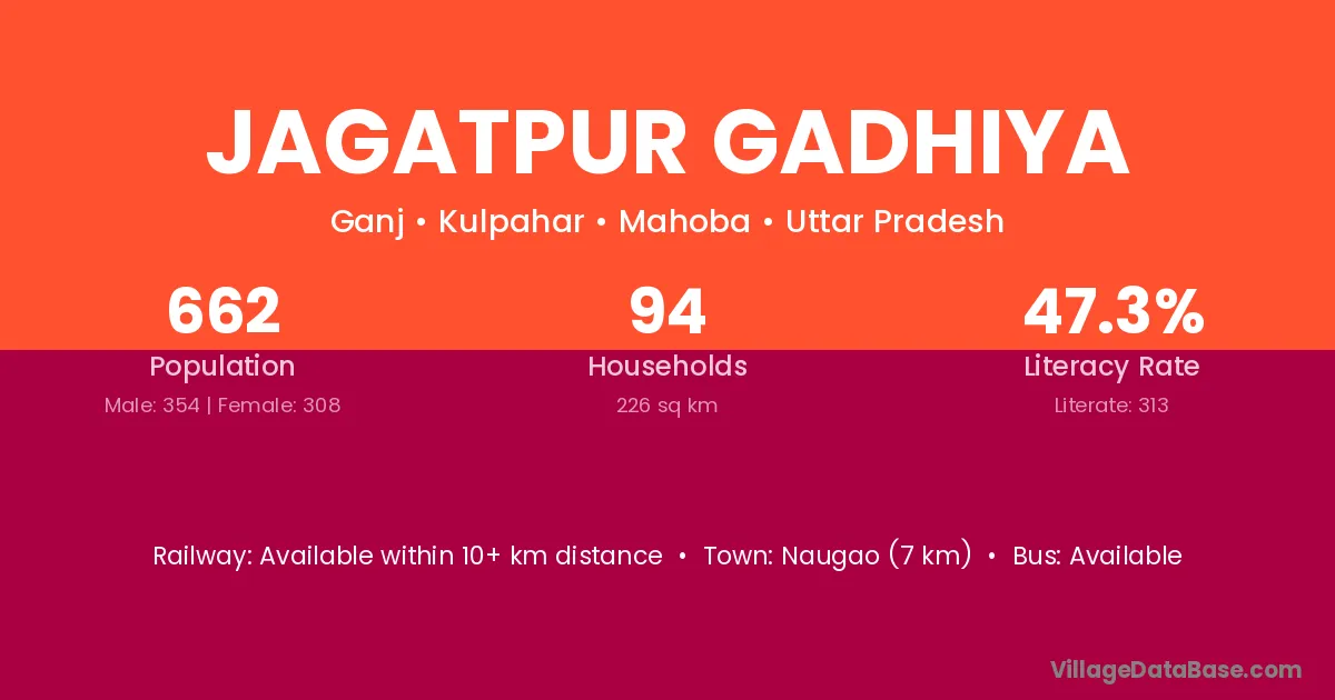 Jagatpur Gadhiya village has a total population of 662 people, of which 354 are males and 308 are females.