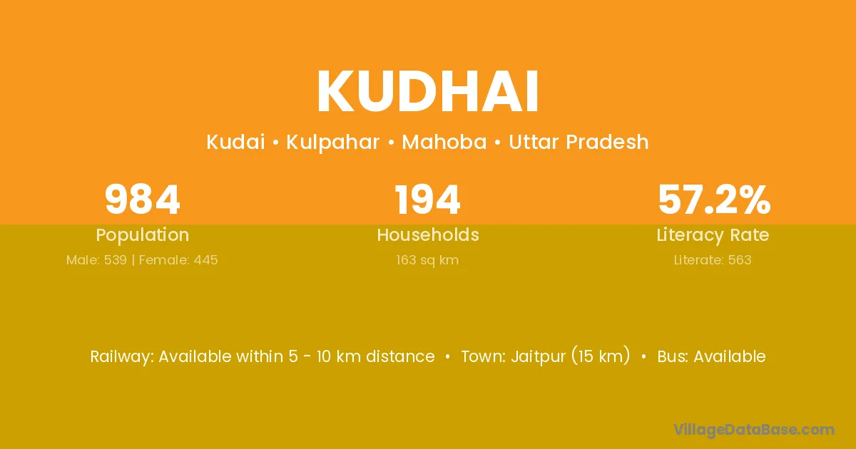 Jaitpur (15 km) is the nearest town to Kudhai village for major economic activities and is located approximately 15 km away.