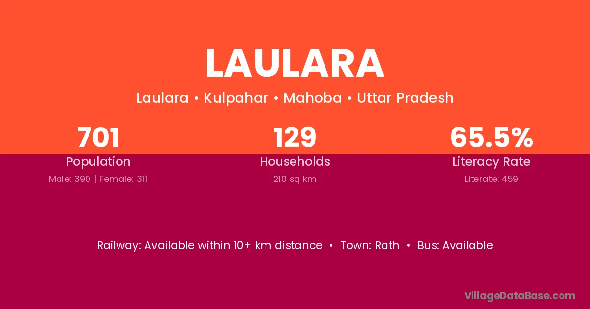 Laulara village has a total population of 701 people, of which 390 are males and 311 are females.