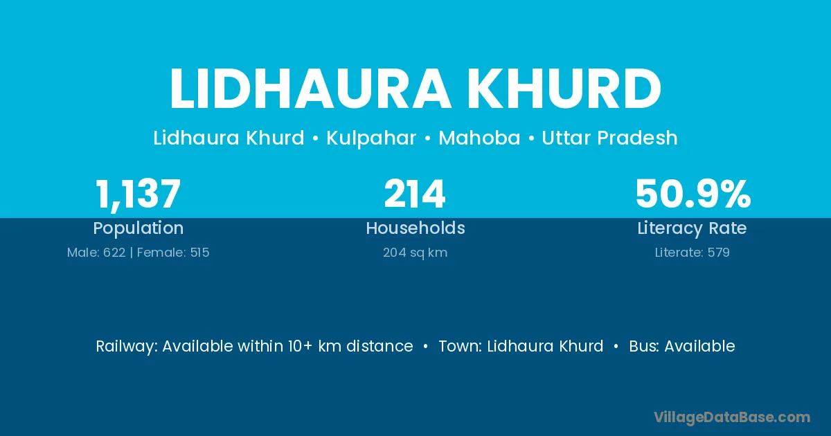 Lidhaura Khurd village has a total population of 1,137 people, of which 622 are males and 515 are females.