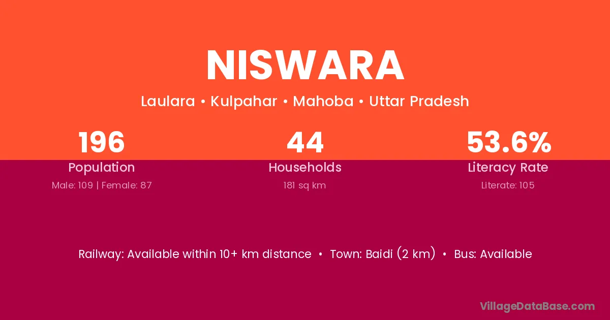 Niswara village has a total population of 196 people, of which 109 are males and 87 are females.