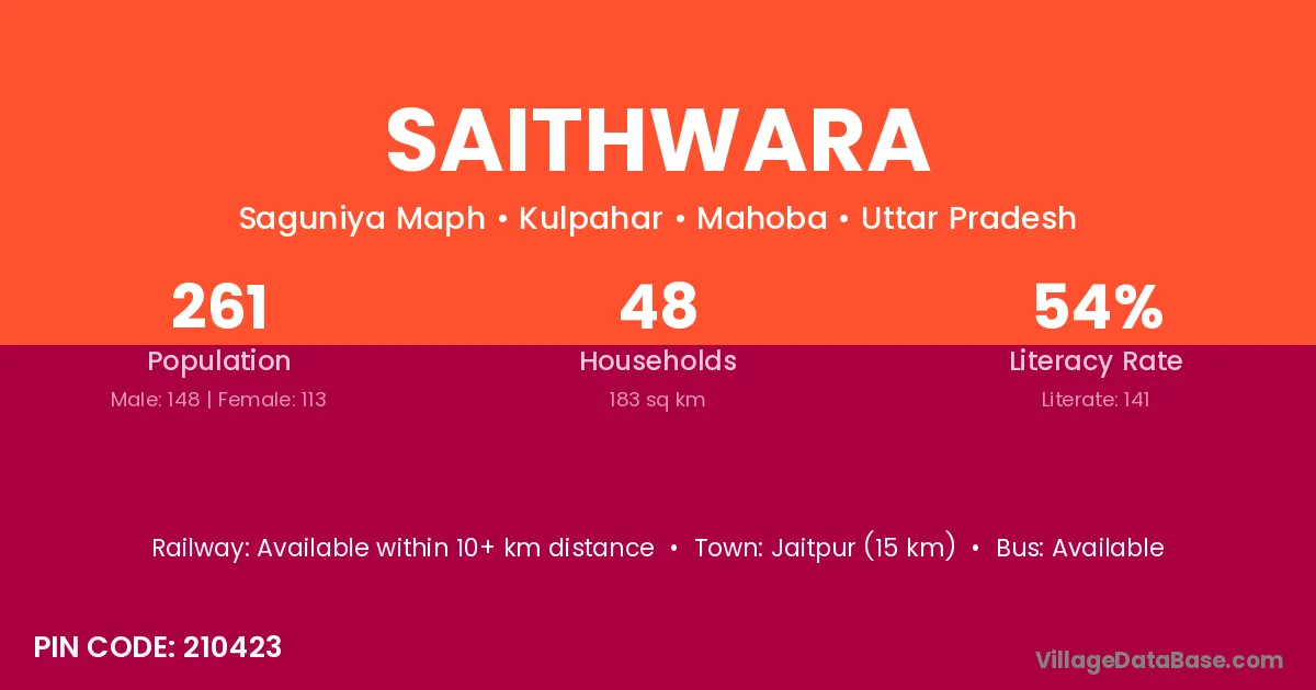 Saithwara village has a total population of 261 people, of which 148 are males and 113 are females.