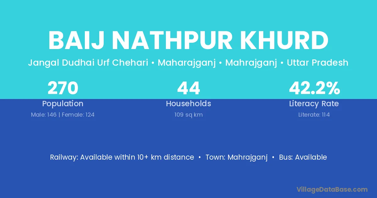 Baij Nathpur Khurd village has a total population of 270 people, of which 146 are males and 124 are females.