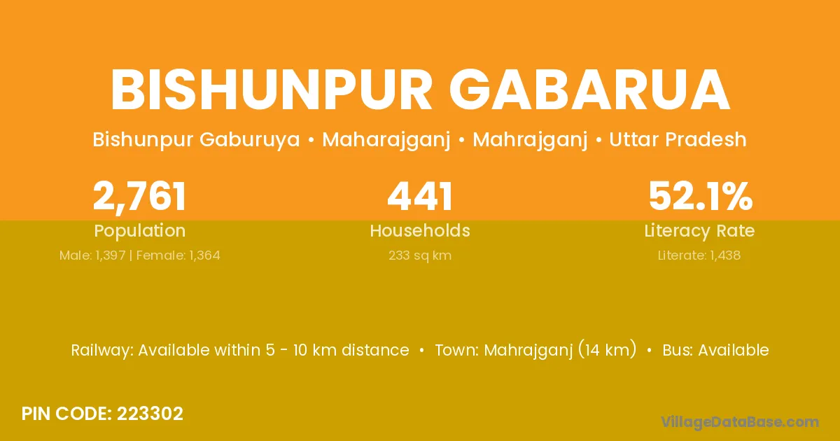 Mahrajganj (14 km) is the nearest town to Bishunpur Gabarua village for major economic activities and is located approximately 14 km away.