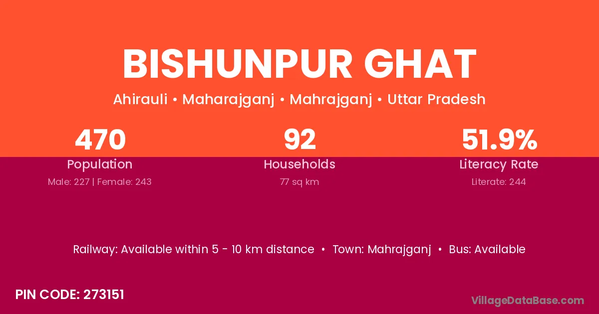 Bishunpur Ghat village has a total population of 470 people, of which 227 are males and 243 are females.
