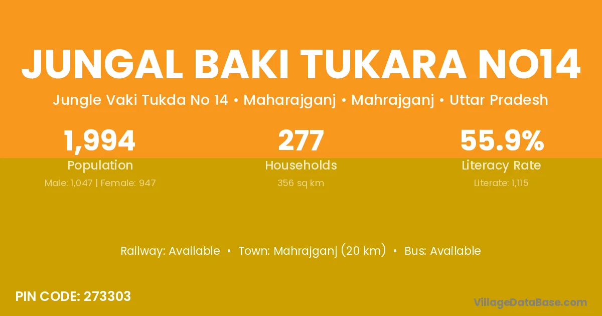 Jungal Baki Tukara No14 village has a total population of 1,994 people, of which 1,047 are males and 947 are females.