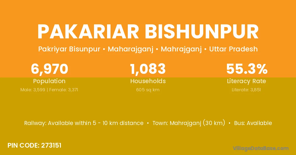 Mahrajganj (30 km) is the nearest town to Pakariar Bishunpur village for major economic activities and is located approximately 30 km away.