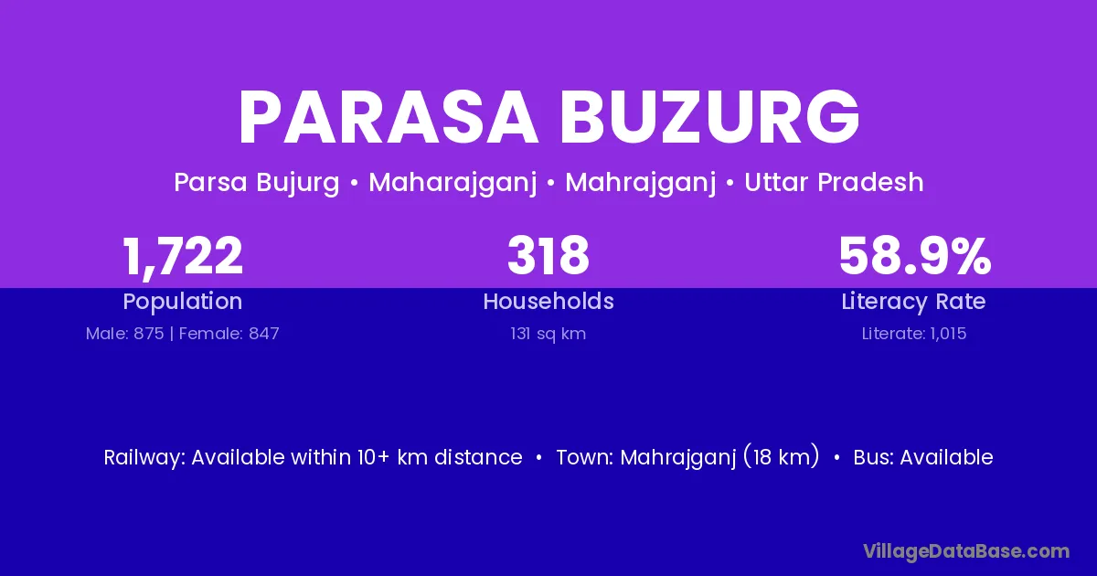 Mahrajganj (18 km) is the nearest town to Parasa Buzurg village for major economic activities and is located approximately 18 km away.
