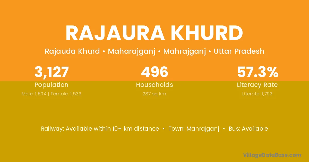Rajaura Khurd village has a total population of 3,127 people, of which 1,594 are males and 1,533 are females.
