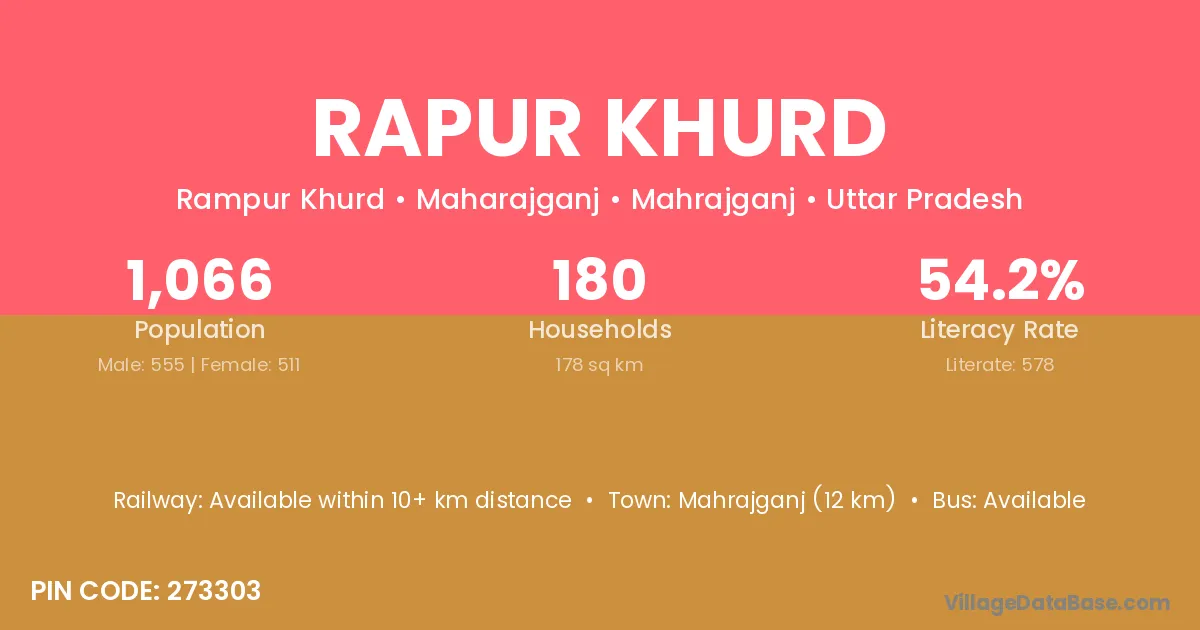 Mahrajganj (12 km) is the nearest town to Rapur Khurd village for major economic activities and is located approximately 12 km away.