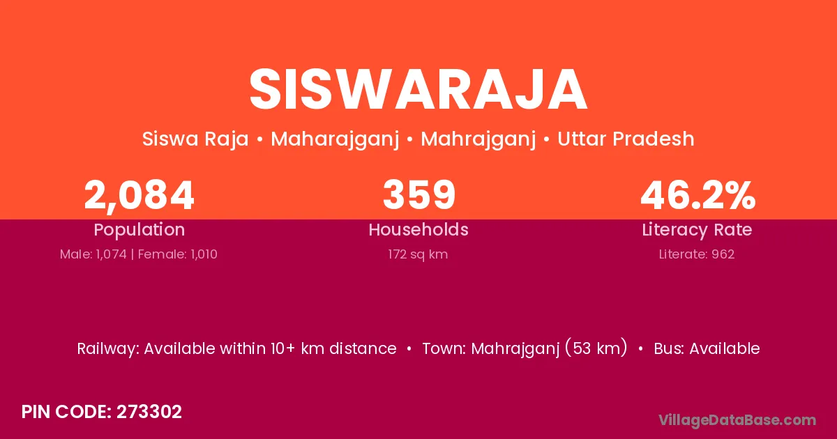Mahrajganj (53 km) is the nearest town to Siswaraja village for major economic activities and is located approximately 53 km away.