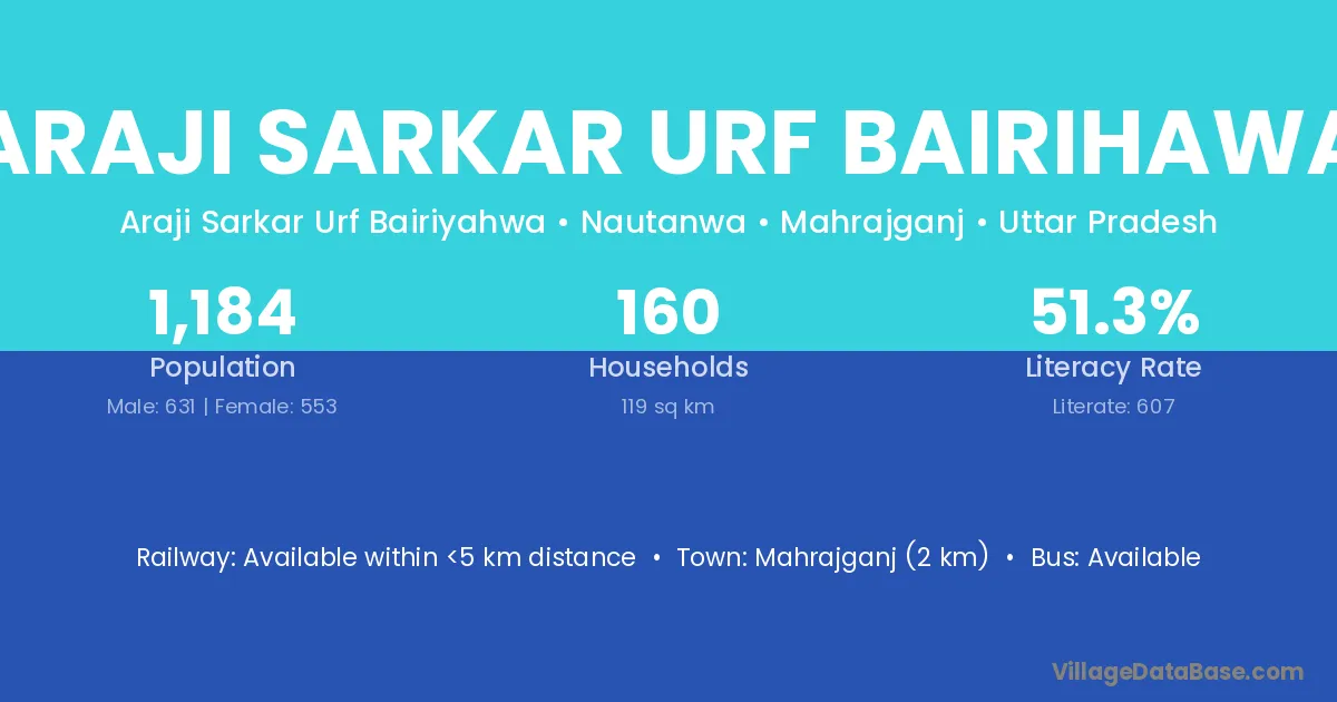 Araji Sarkar Urf Bairihawa village has a total population of 1,184 people, of which 631 are males and 553 are females.
