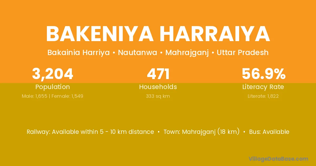 Bakeniya Harraiya village has a total population of 3,204 people, of which 1,655 are males and 1,549 are females.