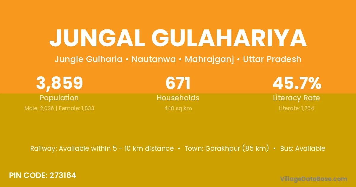 Gorakhpur (85 km) is the nearest town to Jungal Gulahariya village for major economic activities and is located approximately 85 km away.