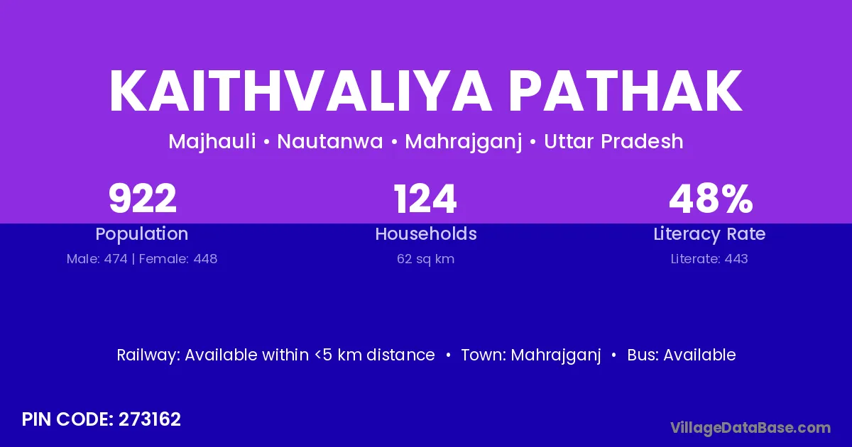 Kaithvaliya Pathak village has a total population of 922 people, of which 474 are males and 448 are females.