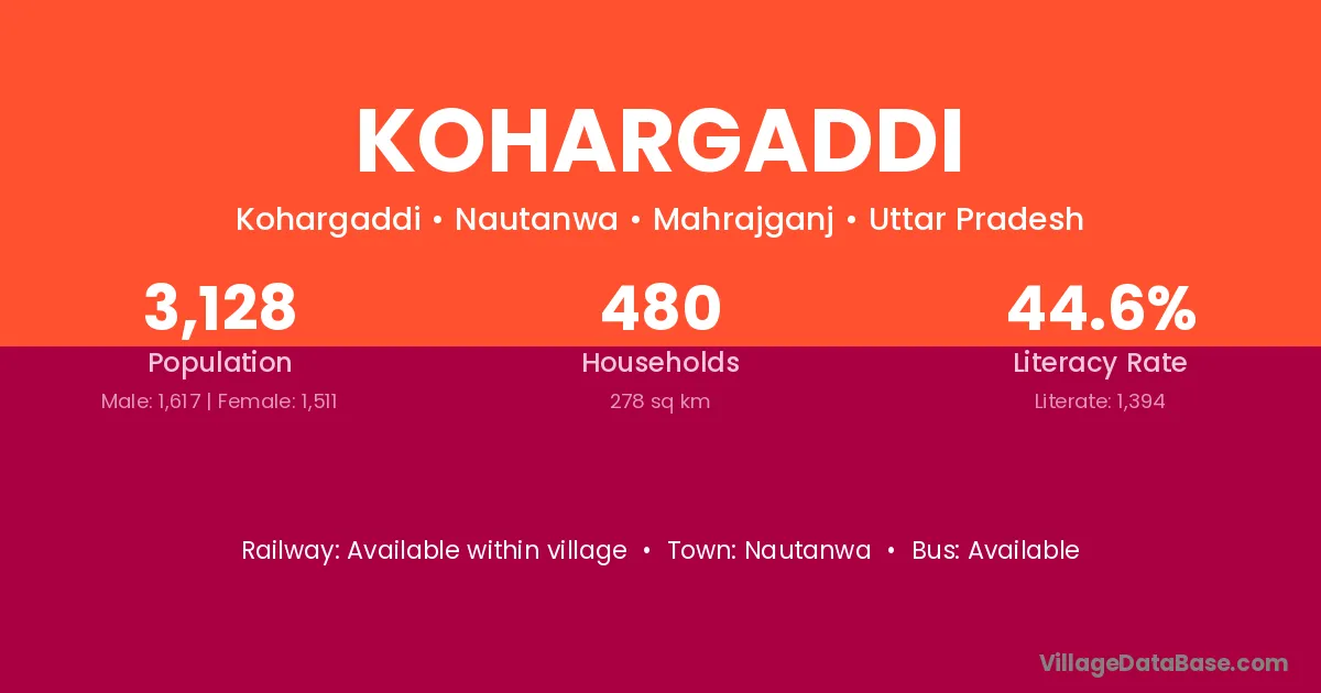 Kohargaddi village has a total population of 3,128 people, of which 1,617 are males and 1,511 are females.