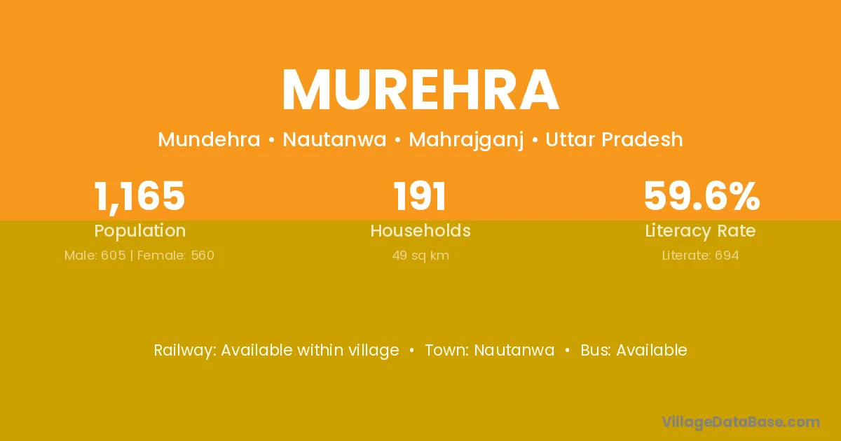 Murehra village has a total population of 1,165 people, of which 605 are males and 560 are females.