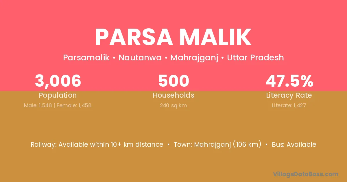 Mahrajganj (106 km) is the nearest town to Parsa Malik village for major economic activities and is located approximately 106 km away.