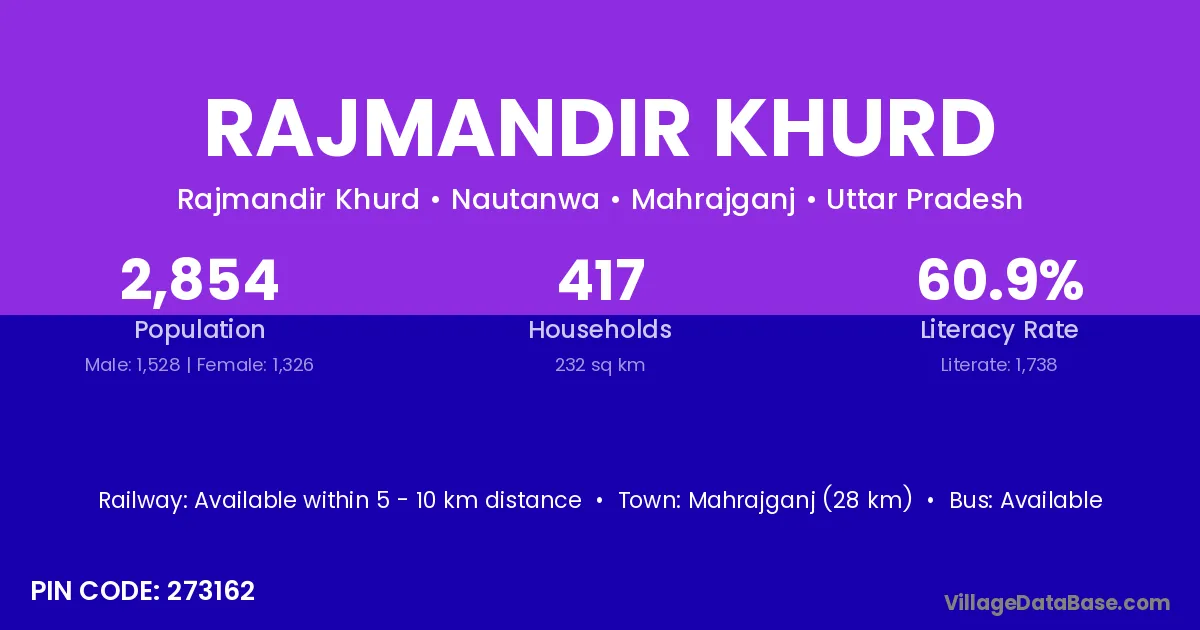 Mahrajganj (28 km) is the nearest town to Rajmandir Khurd village for major economic activities and is located approximately 28 km away.