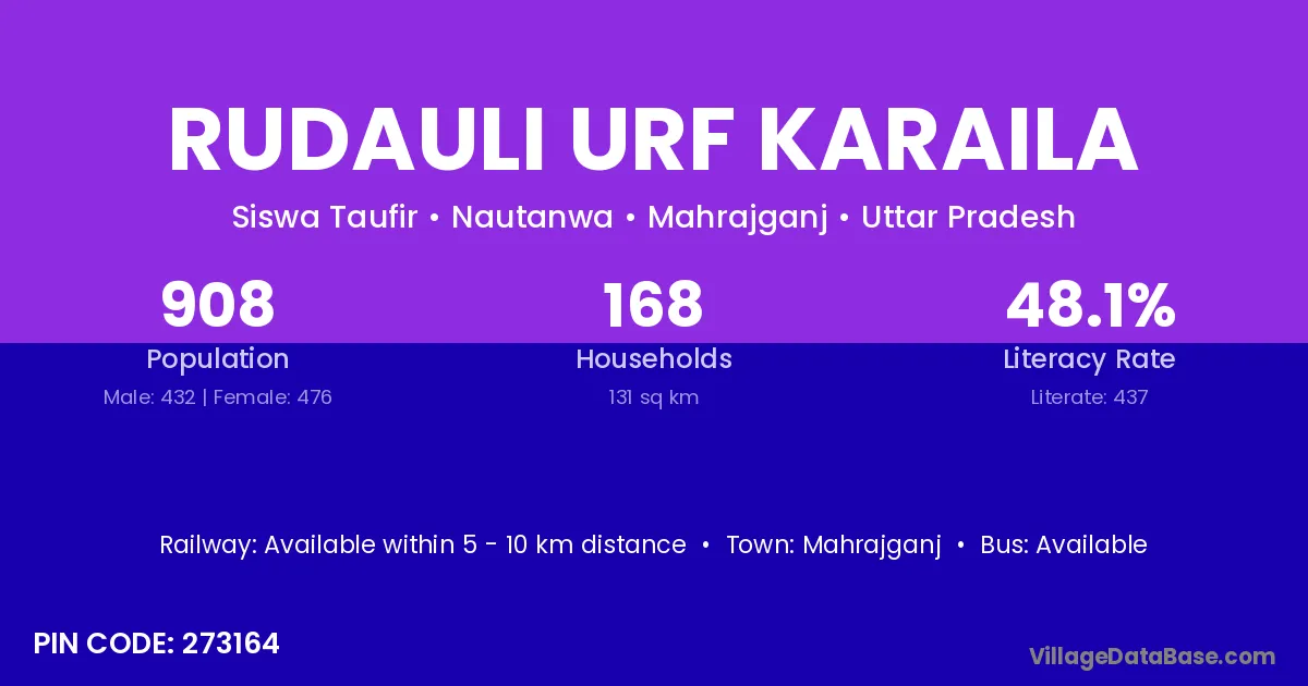 Rudauli Urf Karaila village has a total population of 908 people, of which 432 are males and 476 are females.