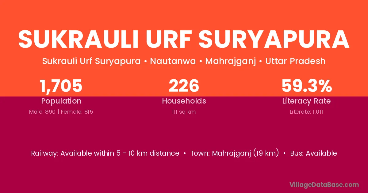 Sukrauli Urf Suryapura village has a total population of 1,705 people, of which 890 are males and 815 are females.