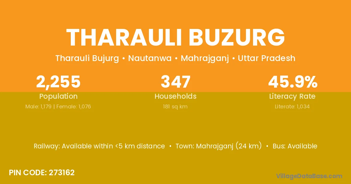 Mahrajganj (24 km) is the nearest town to Tharauli Buzurg village for major economic activities and is located approximately 24 km away.