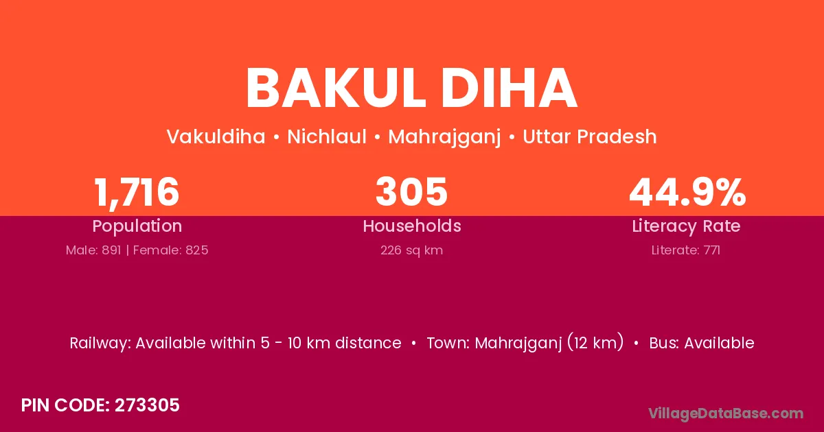Mahrajganj (12 km) is the nearest town to Bakul Diha village for major economic activities and is located approximately 12 km away.