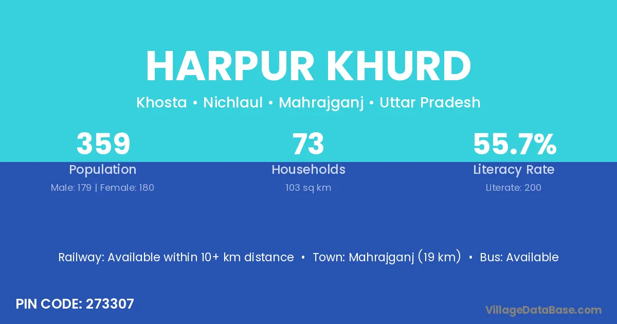 Mahrajganj (19 km) is the nearest town to Harpur Khurd village for major economic activities and is located approximately 19 km away.