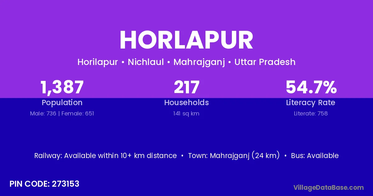 Mahrajganj (24 km) is the nearest town to Horlapur village for major economic activities and is located approximately 24 km away.