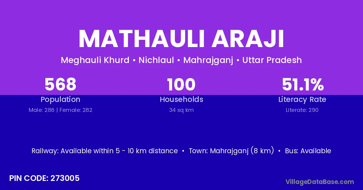 Mahrajganj (8 km) is the nearest town to Mathauli Araji village for major economic activities and is located approximately 8 km away.