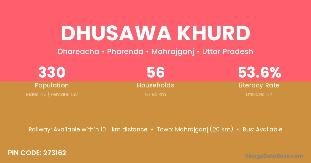Dhusawa Khurd village has a total population of 330 people, of which 178 are males and 152 are females.