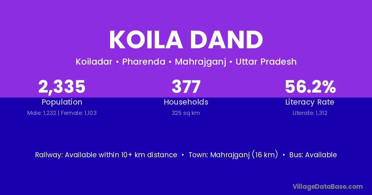 Mahrajganj (16 km) is the nearest town to Koila Dand village for major economic activities and is located approximately 16 km away.