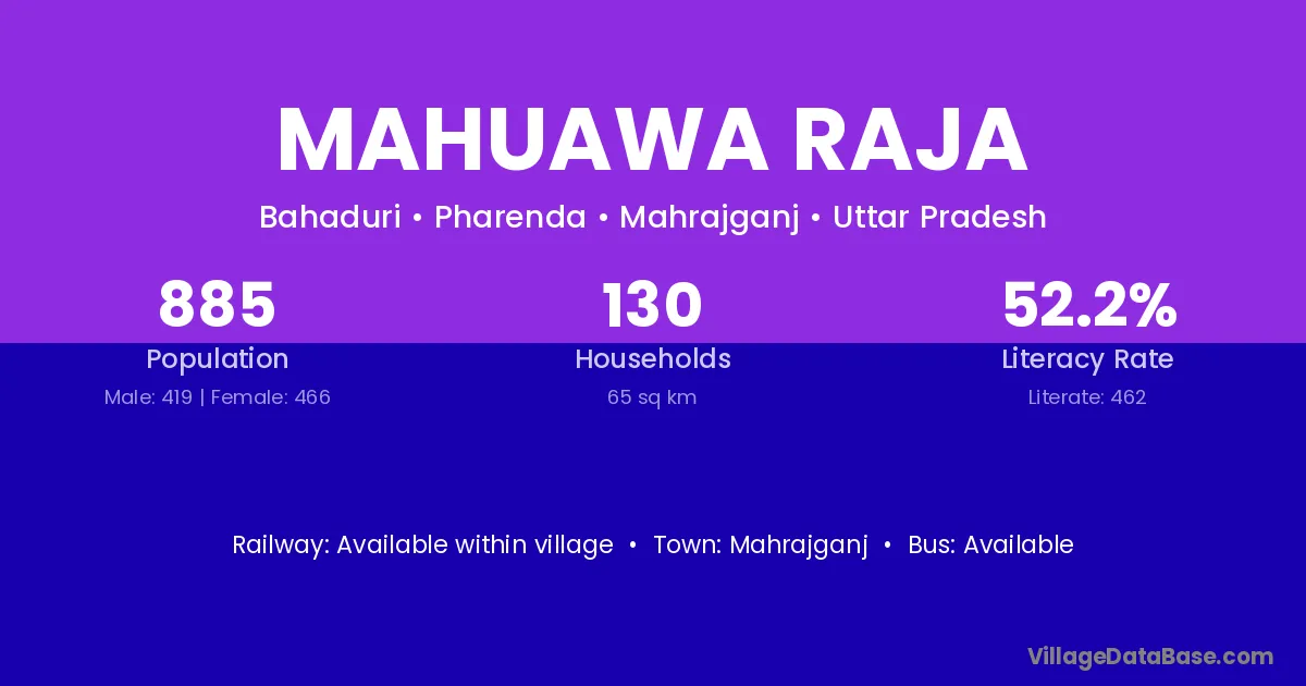 Mahuawa Raja village has a total population of 885 people, of which 419 are males and 466 are females.
