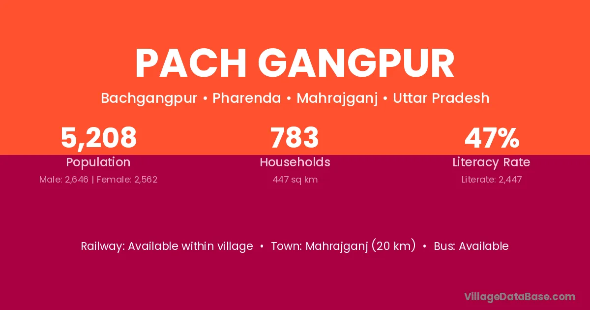 Mahrajganj (20 km) is the nearest town to Pach Gangpur village for major economic activities and is located approximately 20 km away.