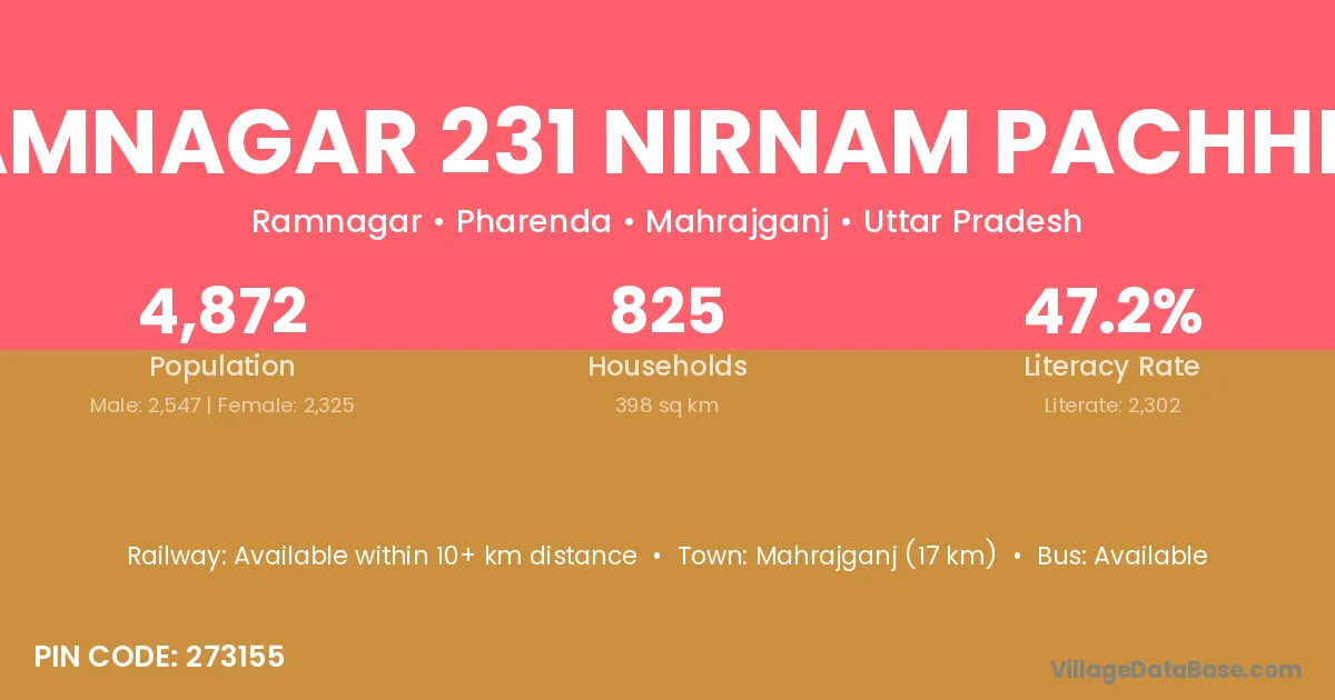 Mahrajganj (17 km) is the nearest town to Ramnagar 231 Nirnam Pachhimi village for major economic activities and is located approximately 17 km away.