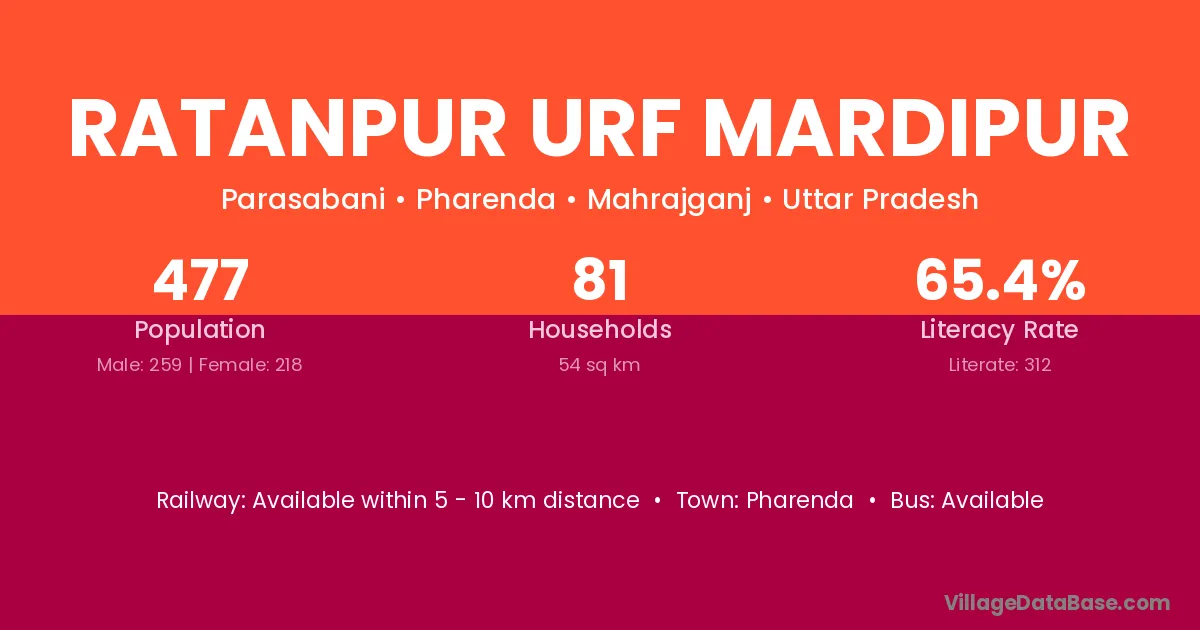 Ratanpur Urf Mardipur village has a total population of 477 people, of which 259 are males and 218 are females.