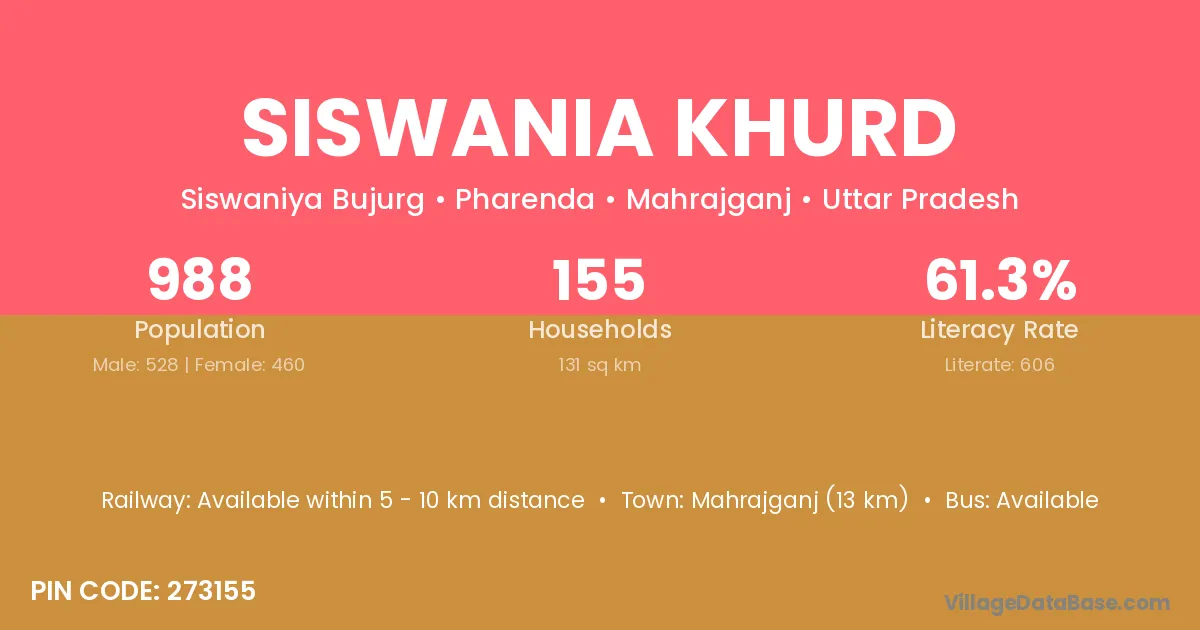 Mahrajganj (13 km) is the nearest town to Siswania Khurd village for major economic activities and is located approximately 13 km away.