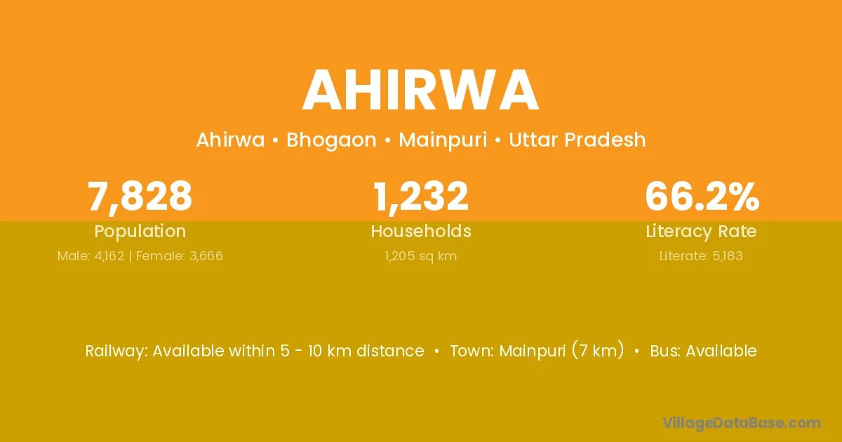Mainpuri (7 km) is the nearest town to Ahirwa village for major economic activities and is located approximately 7 km away.