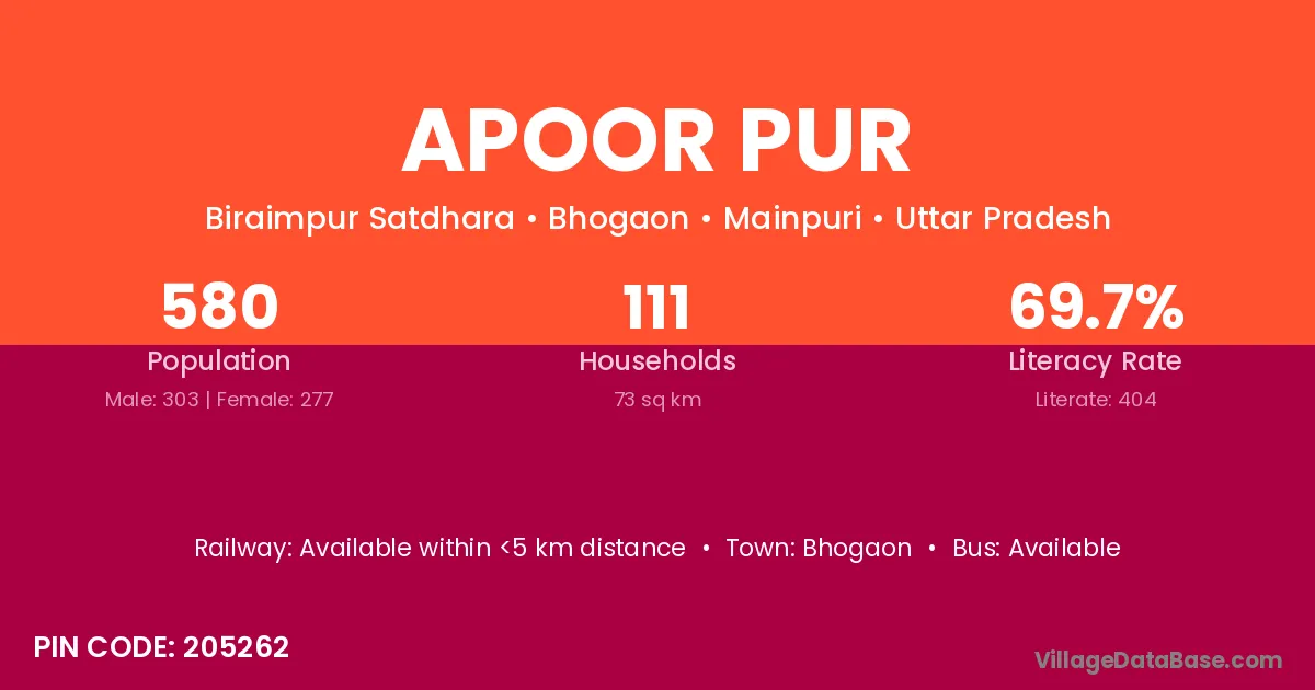 Apoor Pur village has a total population of 580 people, of which 303 are males and 277 are females.