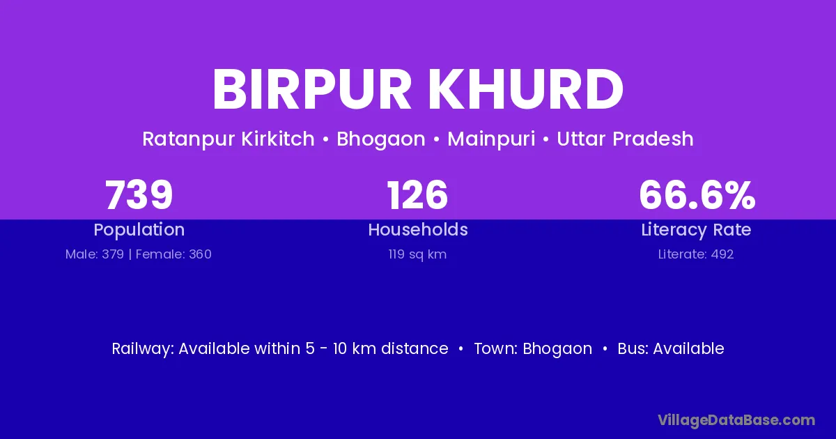 Birpur Khurd village has a total population of 739 people, of which 379 are males and 360 are females.