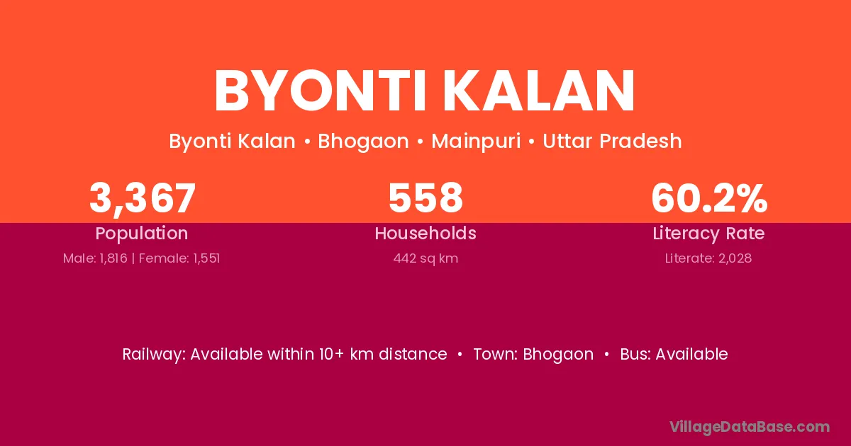 Byonti Kalan village has a total population of 3,367 people, of which 1,816 are males and 1,551 are females.