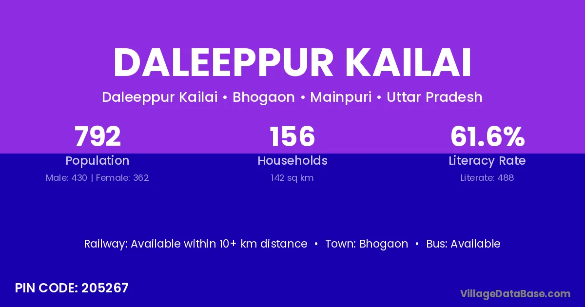 Daleeppur Kailai village has a total population of 792 people, of which 430 are males and 362 are females.