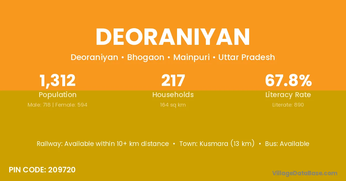 Kusmara (13 km) is the nearest town to Deoraniyan village for major economic activities and is located approximately 13 km away.