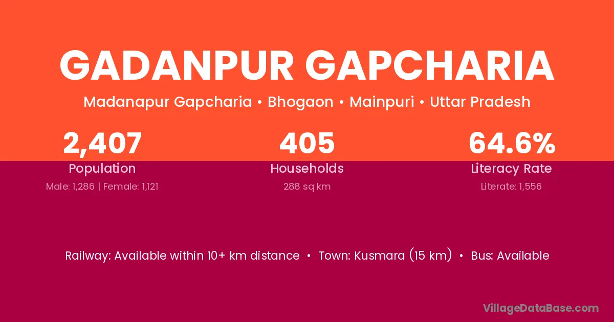 Kusmara (15 km) is the nearest town to Gadanpur Gapcharia village for major economic activities and is located approximately 15 km away.