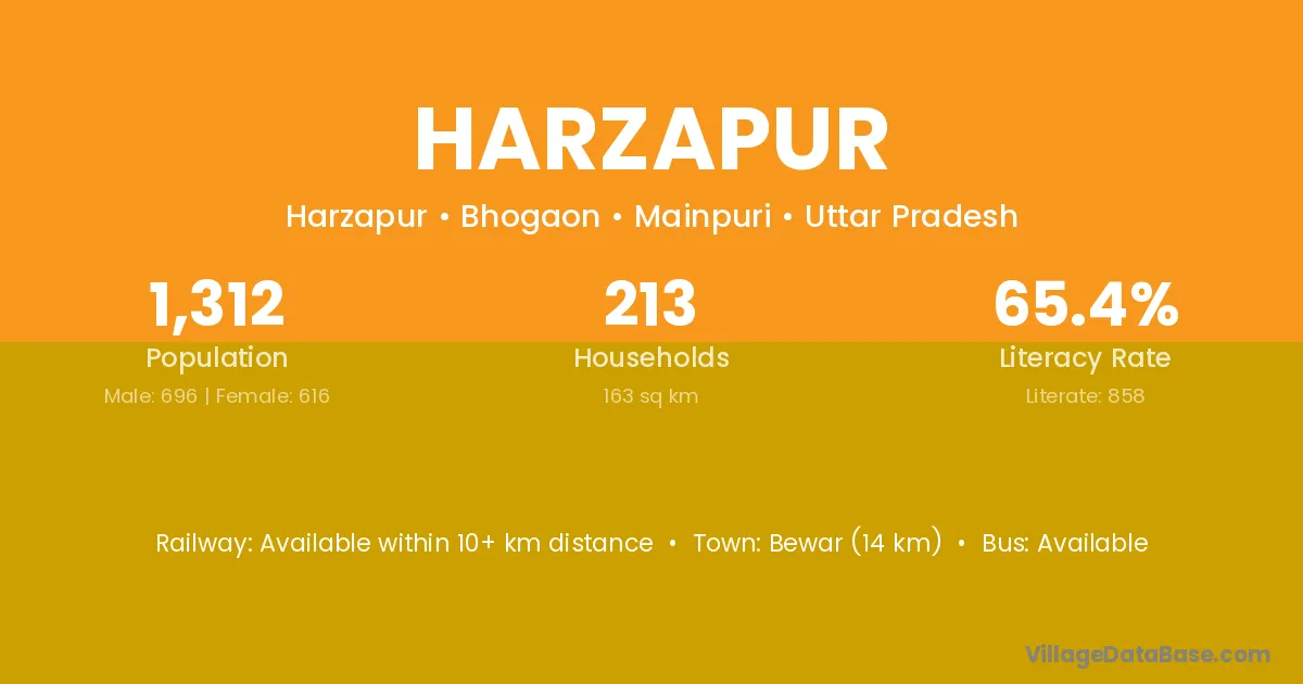 Bewar (14 km) is the nearest town to Harzapur village for major economic activities and is located approximately 14 km away.