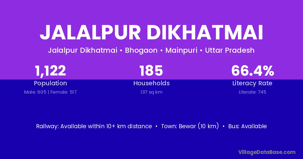 Bewar (10 km) is the nearest town to Jalalpur Dikhatmai village for major economic activities and is located approximately 10 km away.