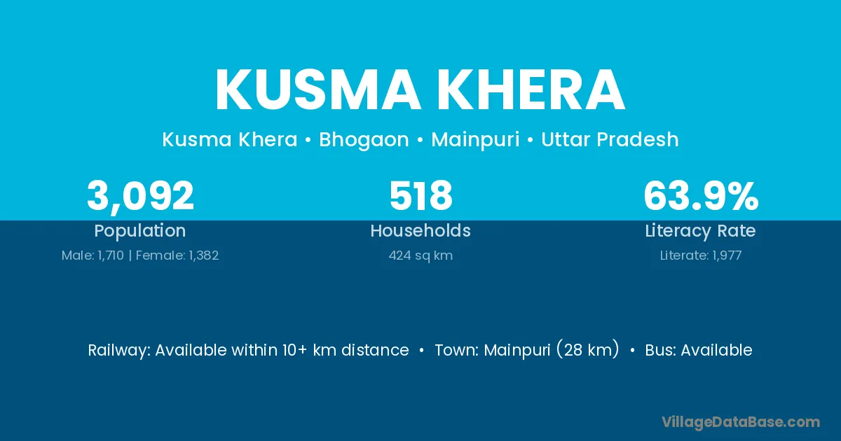 Mainpuri (28 km) is the nearest town to Kusma Khera village for major economic activities and is located approximately 28 km away.