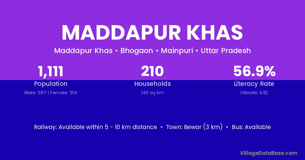 Bewar (3 km) is the nearest town to Maddapur Khas village for major economic activities and is located approximately 3 km away.