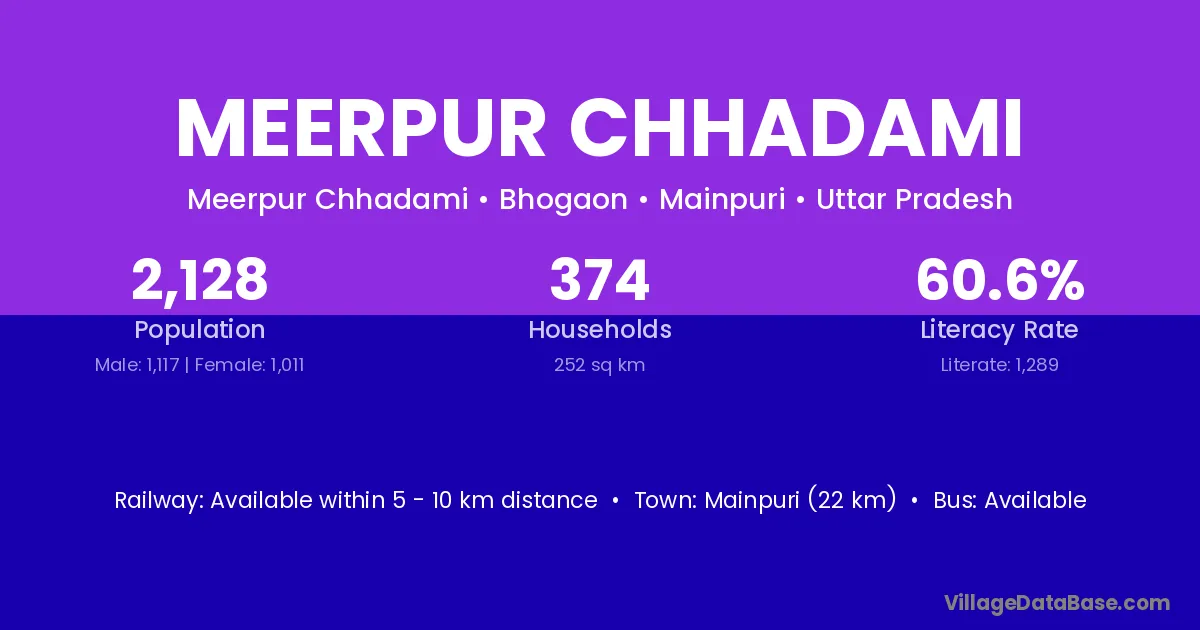 Mainpuri (22 km) is the nearest town to Meerpur Chhadami village for major economic activities and is located approximately 22 km away.